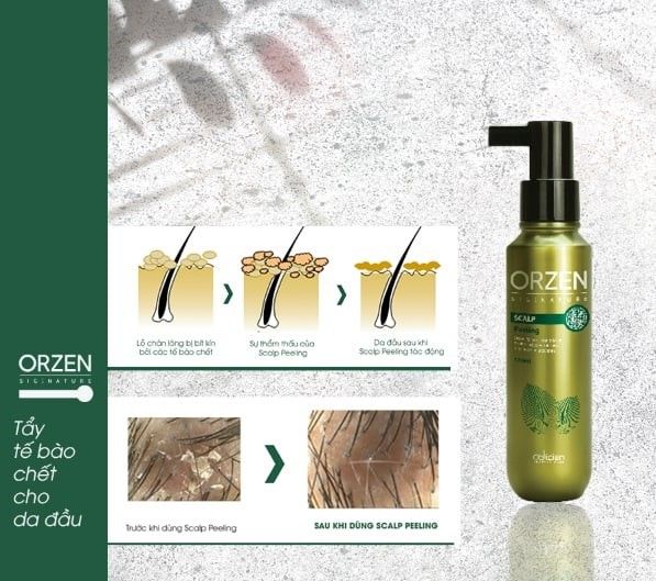 Sản phẩm tẩy tế bào da chết Orzen Signature có dạng lỏng, sẽ tác động nhẹ nhàng lên da đầu để loại bỏ gàu, vảy nến, bã nhờn, da chết và làm sạch da đầu. Với sự kết hợp hoàn hảo từ Salicylic Acid và tinh dầu bạc hà nhanh chóng thấm sâu làm thông thoáng các lỗ chân tóc, lưu thông máu dưới da đầu.